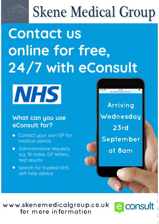 Skene Medical Group- Launch of eConsult ImageSeptember 16, 2020Administrator Share this: Click to share on X (Opens in new window) X Click to share on Facebook (Opens in new window) Facebook Related