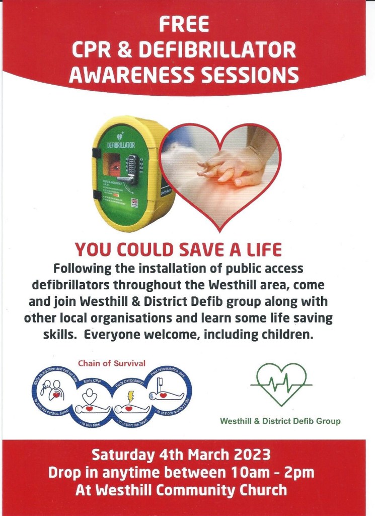 Free CPR & Defibrillator Awareness Sessions on Saturday at Community Church March 1, 2023March 1, 2023Administrator Share this: Click to share on X (Opens in new window) X Click to share on Facebook (Opens in new window) Facebook Related
