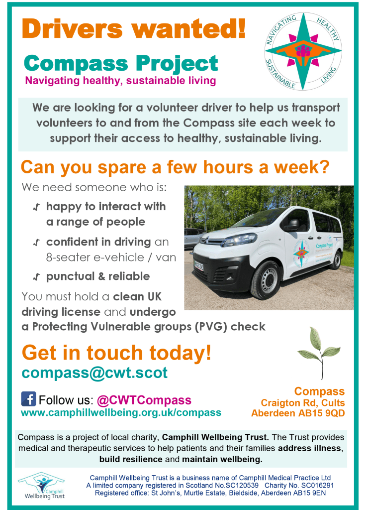 Drivers wanted for Compass Project in Cults ImageOctober 11, 2023Administrator Share this: Click to share on X (Opens in new window) X Click to share on Facebook (Opens in new window) Facebook Related