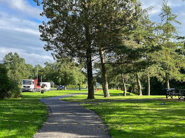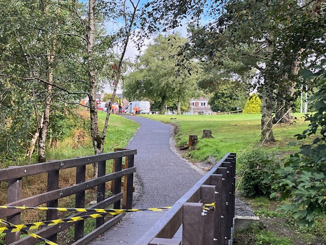 Our contractor is now on site laying the top layer of bonded material on top of the quarry material that was laid earlier in the summer. Work areas will be cordoned off as illustrated, and as work progresses around the park. Please respect the cordoned off markings as the material needs at least 24 hours to cure. Thank you