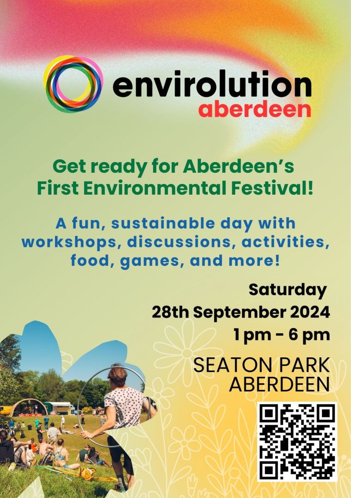 Aberdeen’s first environmental festival ‘Envirolution Aberdeen‘ is happening at Seaton Park on Saturday, 28th September 2024 from 1pm to 6 pm. It is an all-inclusive, free and fun festival with workshops, interactive stalls, climate campaign information, performances, food and more! You can find more information and how to get involved at www.nescan/org/envirolution